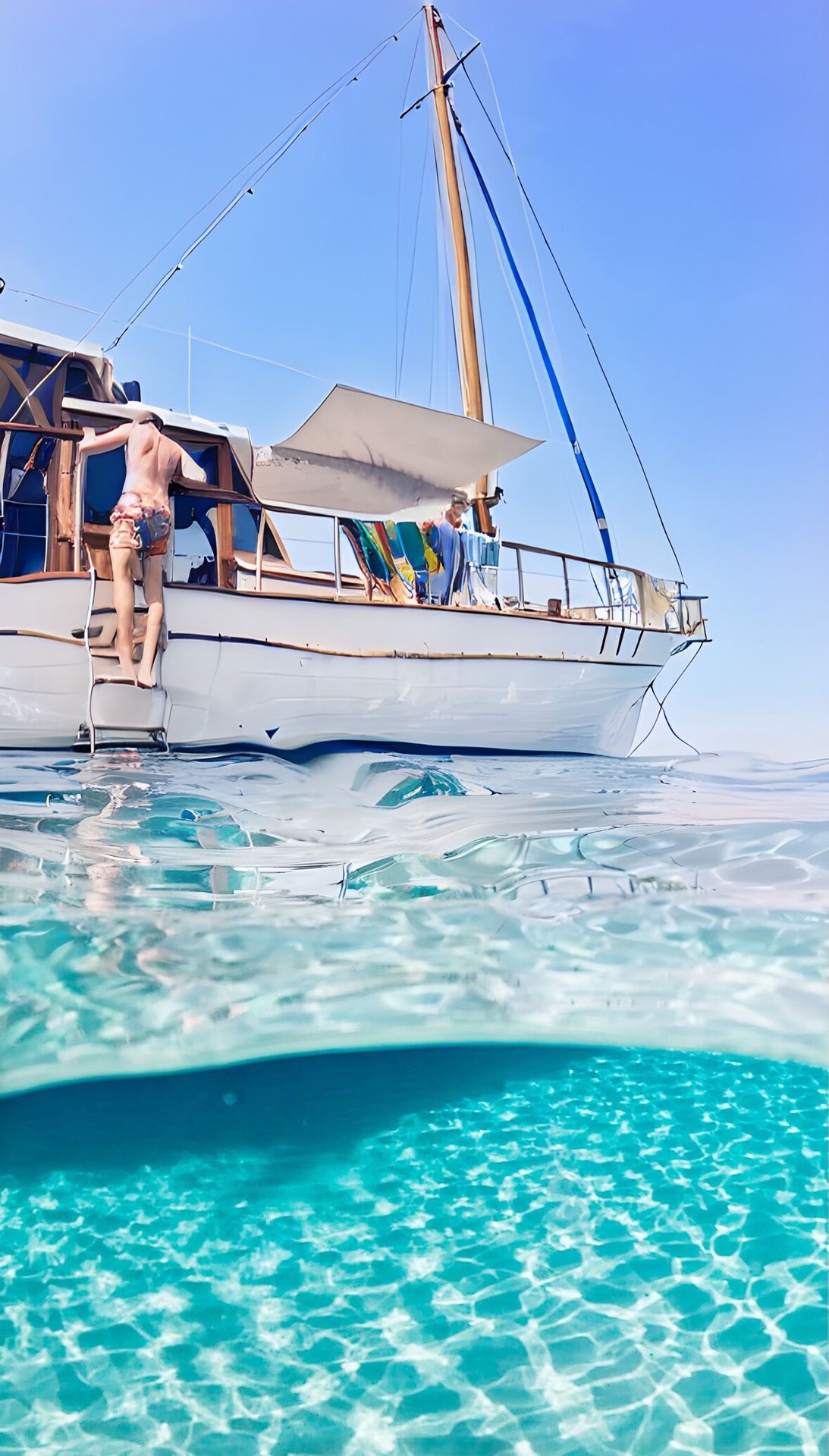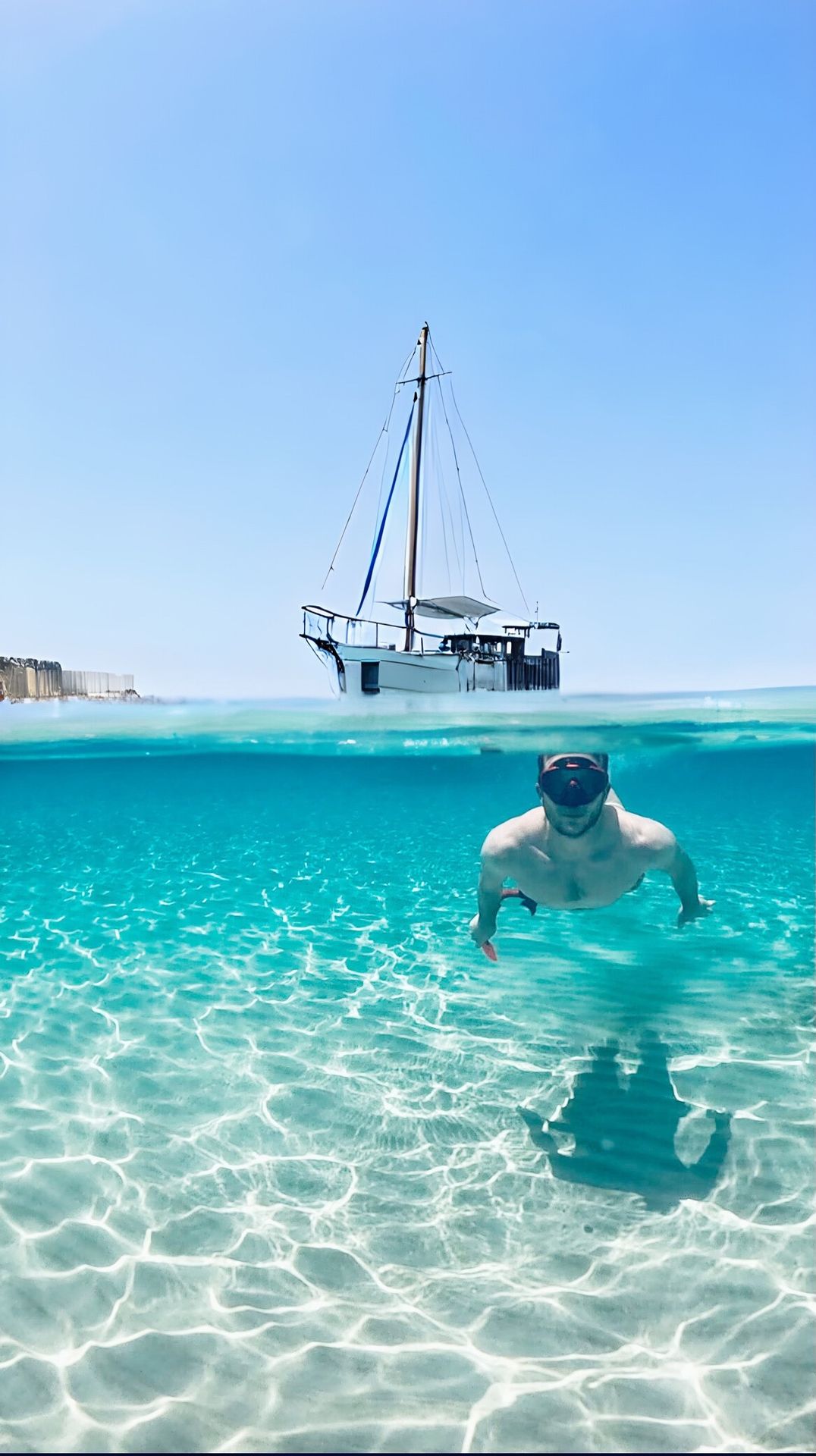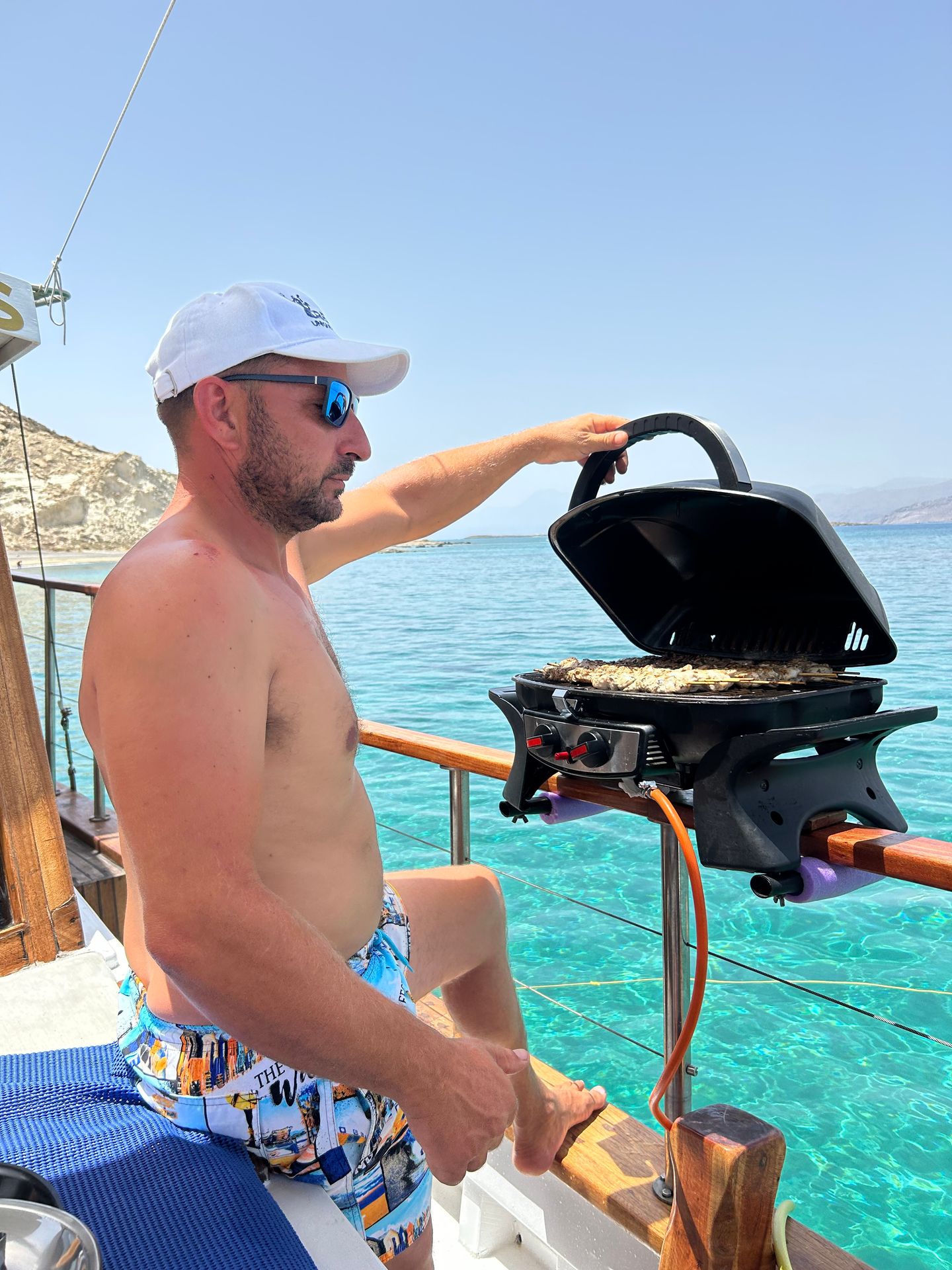 Our day began in Makry Gialos, a charming fishing village on Crete’s southeast coast. From there, we boarded the Triton—a beautiful traditional wooden sailing boat that fits up to 19 guests. The crew was super friendly and welcoming, which made the whole trip feel cozy and personal right from the start.